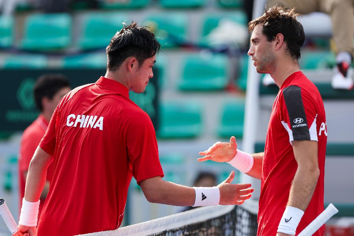 新快报讯 2月6日,戴维斯杯世界I组附加赛中国队主场对阵葡萄牙队的比赛在南沙国际网球中心开战。在首日的比赛中进行了两场单打,布云朝克特首战以两个4-6不敌亨里克·罗沙,吴易昺则以6-1和7-6击败努诺·博杰斯,帮助中国队以1∶1扳平总比分。